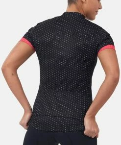 The Essential cycling jersey with print by ODLO in regular fit accompanies you on your tour and your everyday training. The three pockets at the back and the non-slip silicone band at the hem make it an absolute basic for all female cyclists – and the classic dot pattern does the rest.