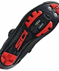 Carbon fiber-reinforced nylon sole with grippy plastic inserts and rubberized SIDI logo in the midsole area, for optimum traction in running passages and more safety when entering the pedal. Exchangeable thread inserts in the cleat area, additional inserts for optional studs. Compatible with all standard MTB pedal systems. Interchangeable profile insert in the toe area.